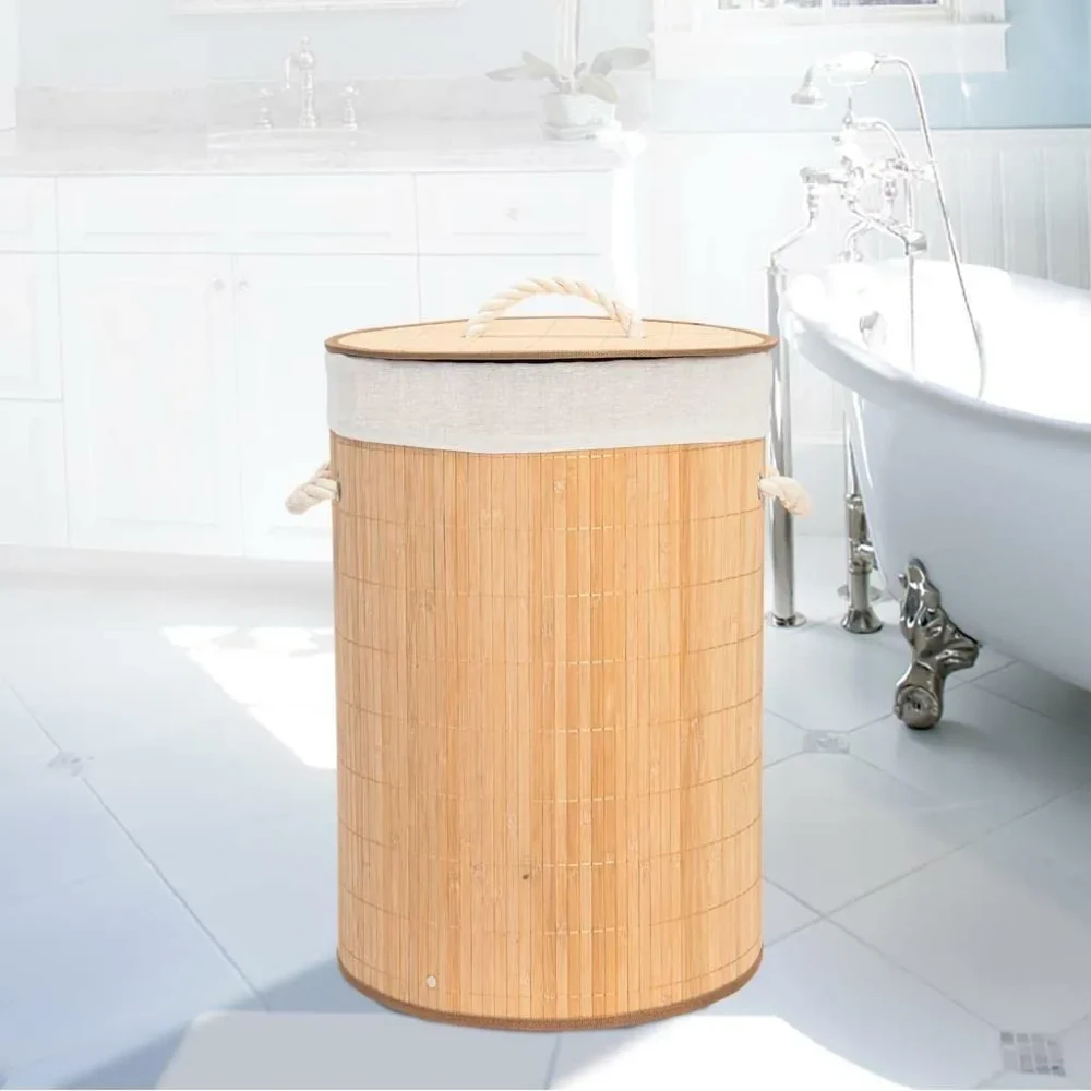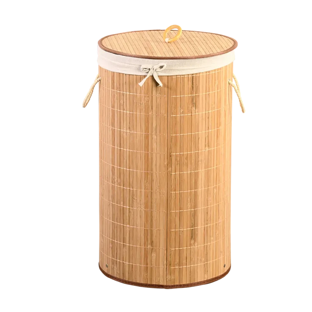 Корпа за руби во кругла форма додава модерен и стилски допир во вашиот дом. Со својата едноставна, но елегантна форма, корпа лесно се вклопува во различни декори. Бамбусот додава природен и топол изглед, што ја прави идеална за употреба во дневни соби, бањи или соби за перење.