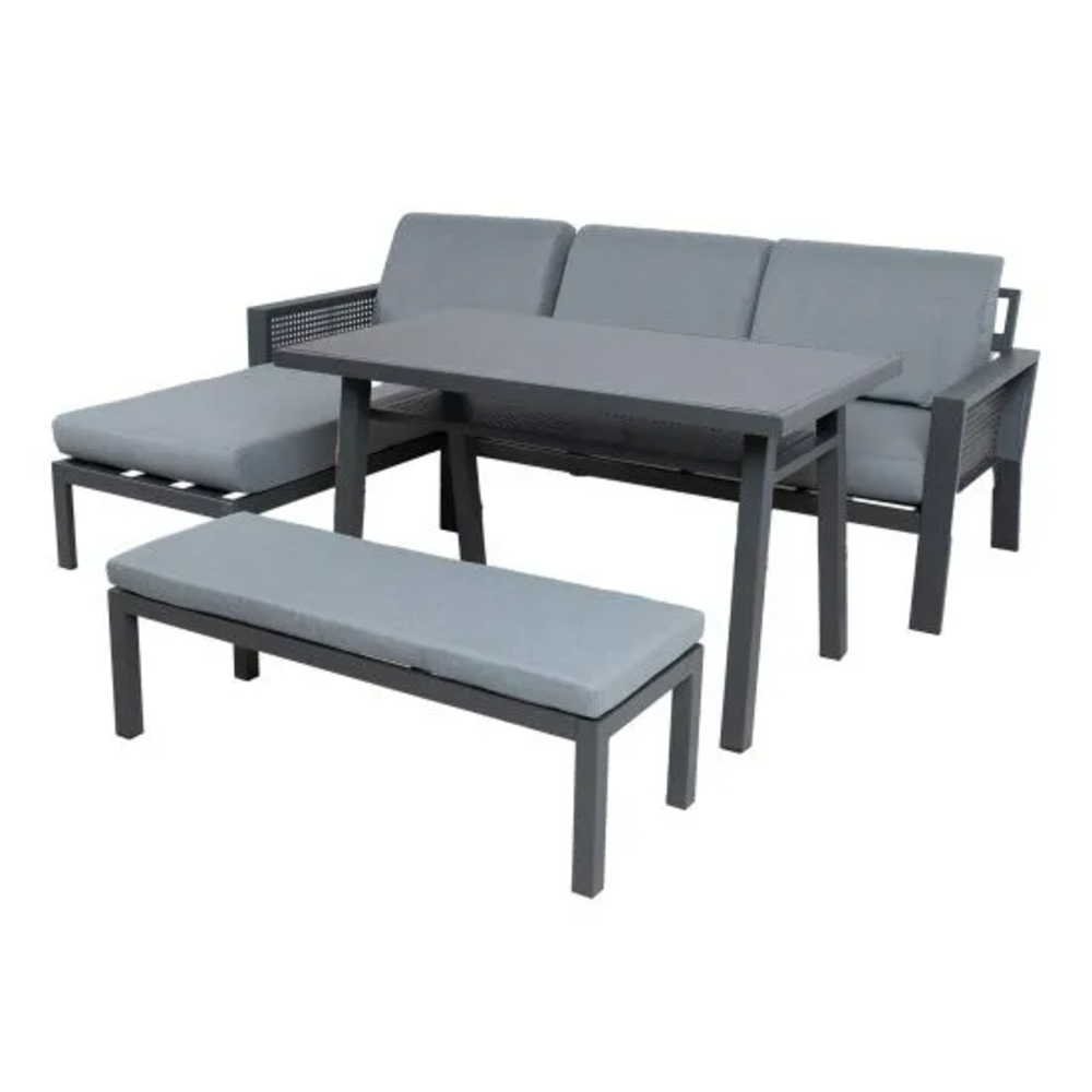 Со аголната гарнитура за градина DELGADO ќе создадете модерен и функционален надворешен простор, идеален за уживање со семејството и пријателите. Опуштете се во удобноста што ја нуди овој висококвалитетен мебел и направете го вашиот двор или тераса уште попривлечен.