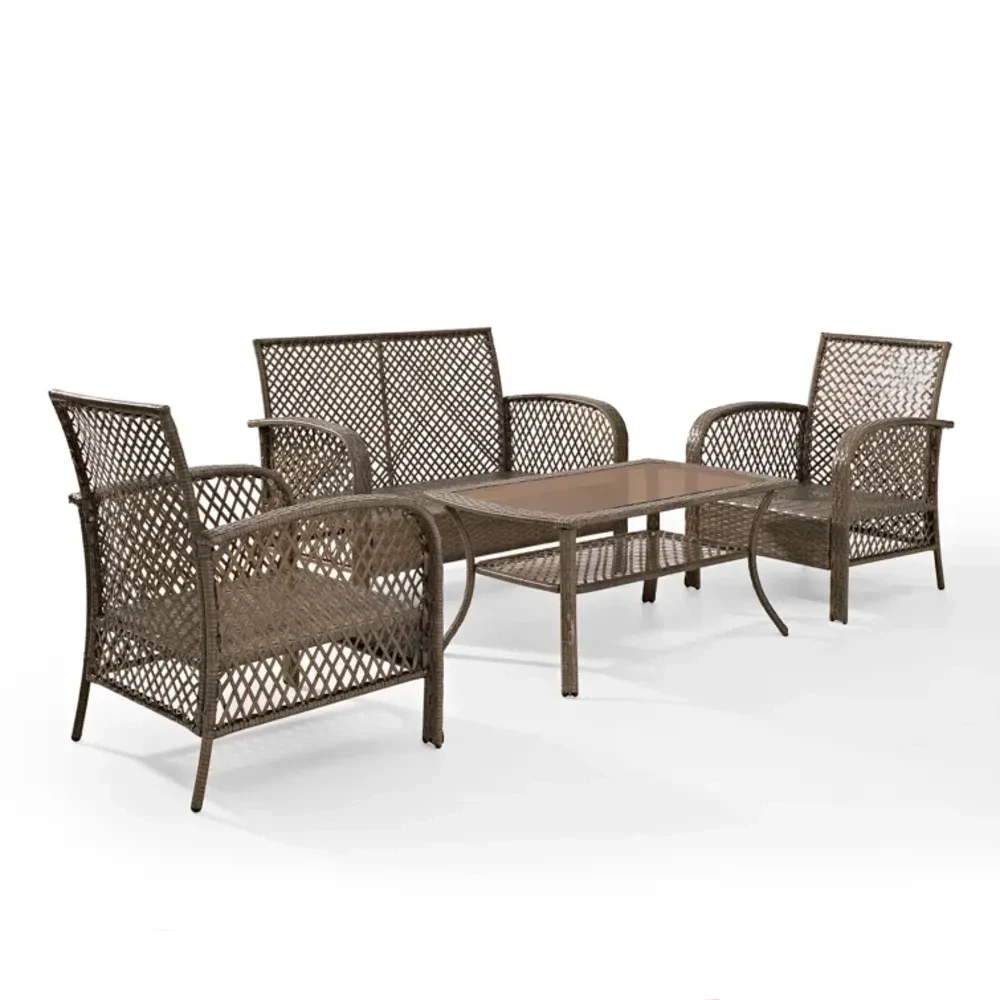 Овој минималистички сет се состои од 4 делови: една двојна клупа, две поединечни фотелји и една масичка со калено стакло. Сите елементи може да се разместуваат и комбинираат по ваша желба. Без разлика дали ја користите во тесен балкон или во голема градина, секогаш ќе најдете соодветно решение.