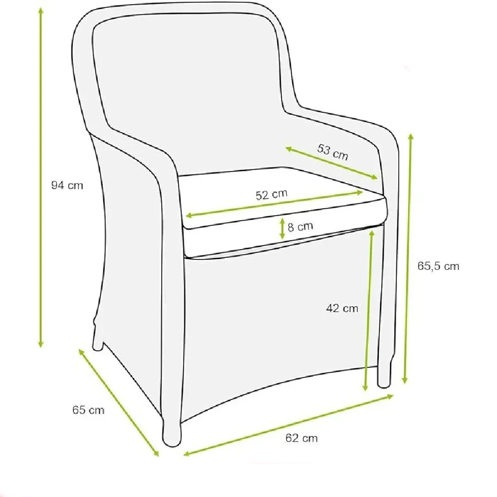 За дополнителна удобност, сетот вклучува 8 столици со ергономски дизајнирани потпирачи и дебели перничиња. Овие перничиња обезбедуваат оптимална поддршка, додека нивниот водоотпорен материјал овозможува лесно одржување.