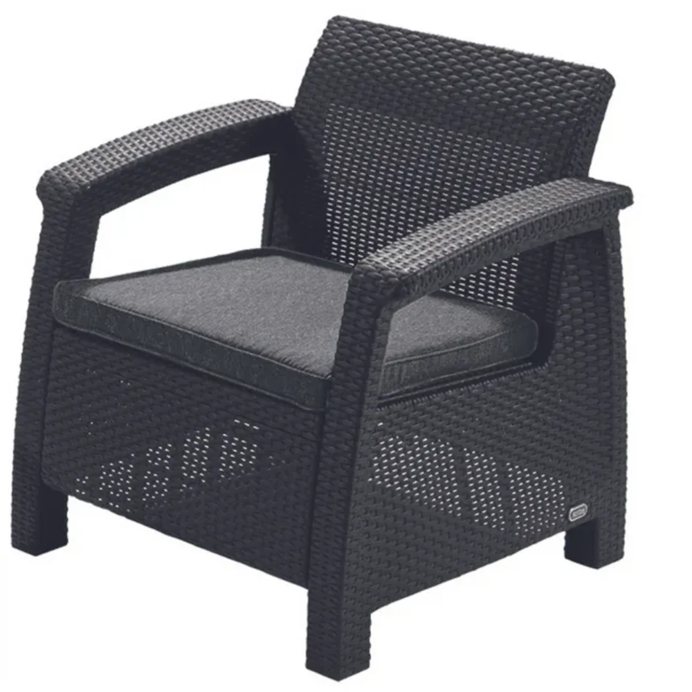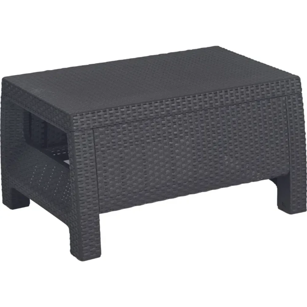 Оваа модерна гарнитура е изработена од издржлива пластична смола, што гарантира долготрајност и отпорност на различни временски услови. Современата Graphite боја со рамна плетена текстура додава елегантен изглед, додека лесната конструкција овозможува лесно преместување и прилагодување на просторот.