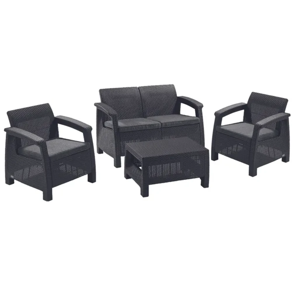 Создадете совршено место за одмор на отворено со оваа стилска и комфорна Сет гарнитура двосед Corfu. Без разлика дали сакате да уживате во утринското кафе, да се релаксирате по напорен ден или да поминувате квалитетно време со семејството и пријателите, овој сет обезбедува идеална атмосфера. Со модерен дизајн и ергономска удобност, оваа гарнитура претставува совршен избор за секој двор, тераса или градина.
