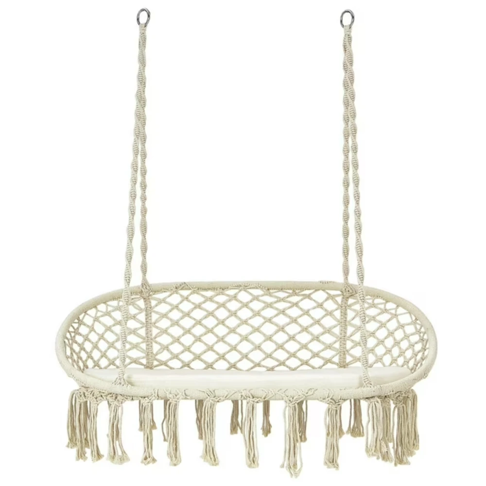 Овој модел нуди комбинација од удобност, стабилност и модерен бохо стил, што го издвојува од класичните лулашки. Благодарение на цврстата челична конструкција и силните плетени јажиња, може безбедно да издржи до 150 кг (330 lbs).