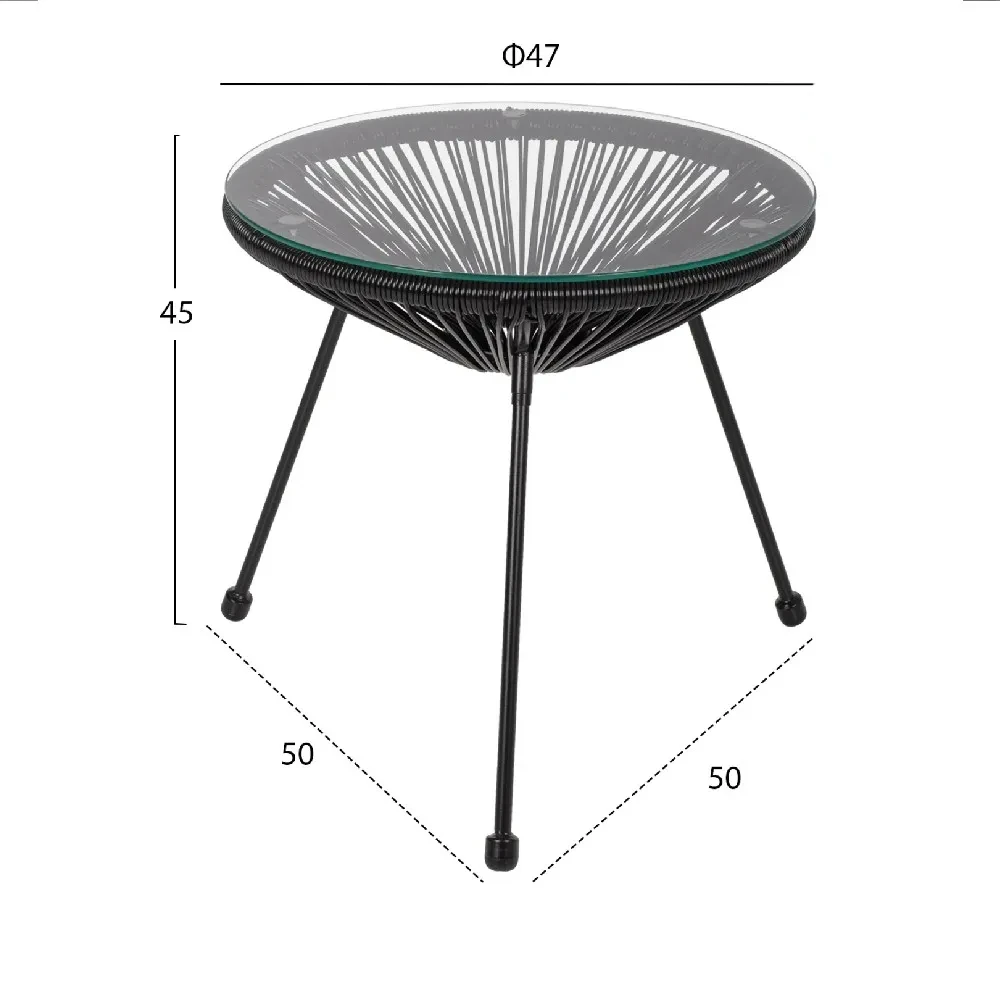 Масата е изработена од полиетиленски (PE) ратан, материјал познат по својата отпорност на надворешни влијанија и секојдневна употреба. Ратанската плетка не само што изгледа природно, туку обезбедува и стабилна структура. Основата е засилена со челична тубуларна рамка, која ја прави масата цврста и безбедна за користење.