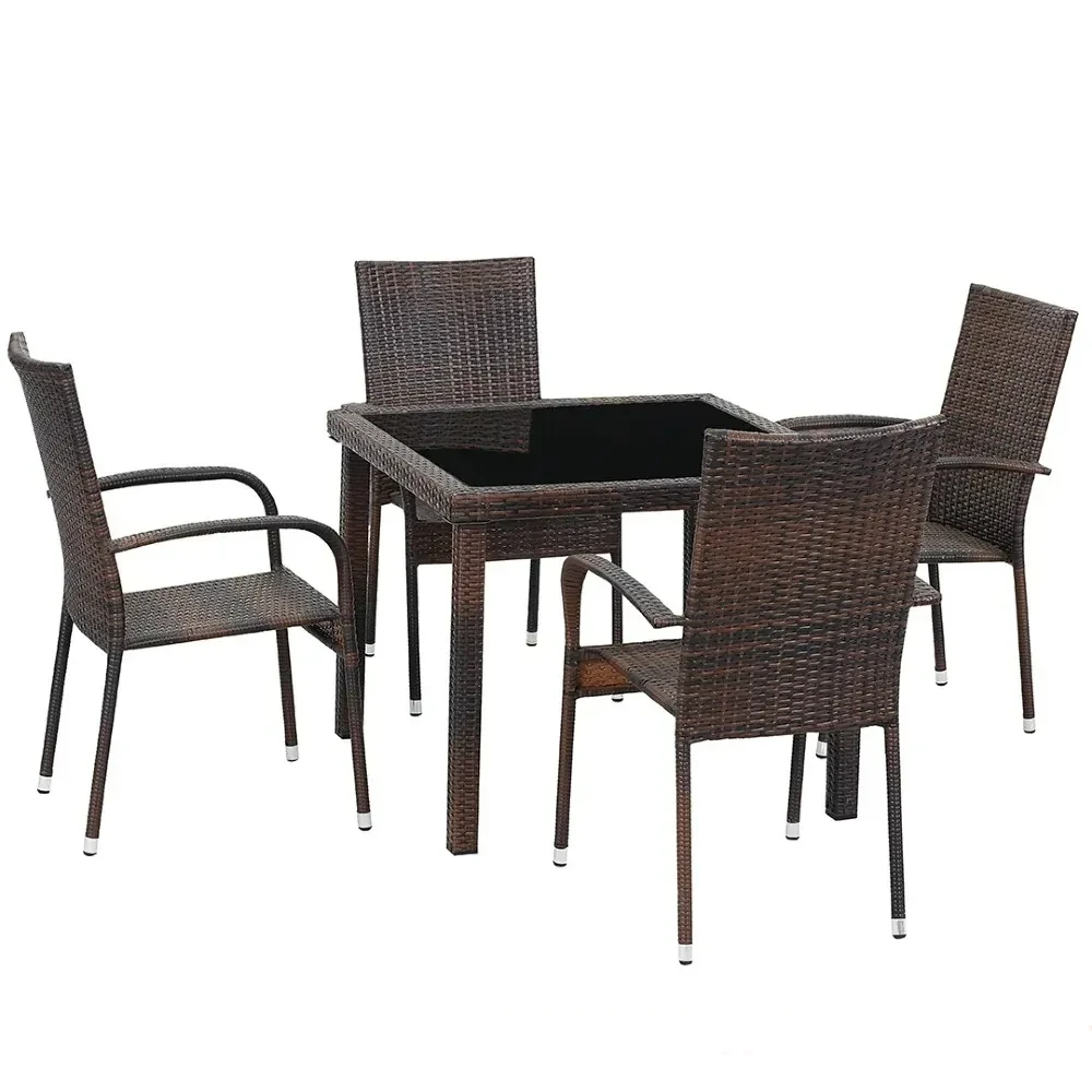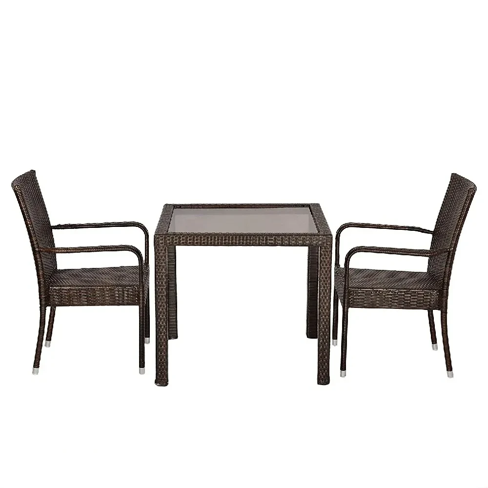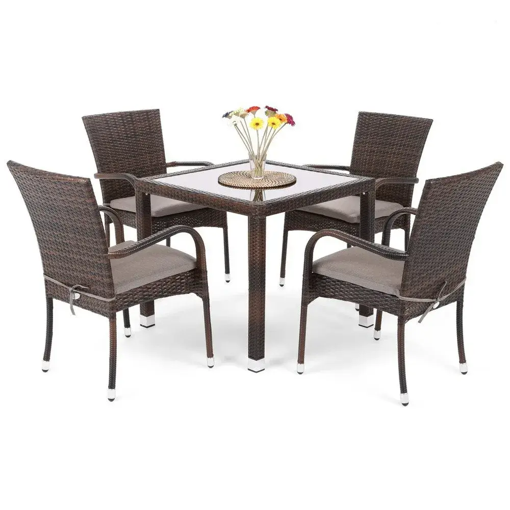 Сетот вклучува четири столчиња и квадратна маса со компактни димензии, погодни за мали и големи простори. Синтетичкиот ратан кој го обложува столчињата нуди природен изглед и чувство, додека каленото стакло на масата обезбедува лесно чистење и одржување. Челичната конструкција со прав обложување гарантира висока стабилност и издржливост на сите временски услови.