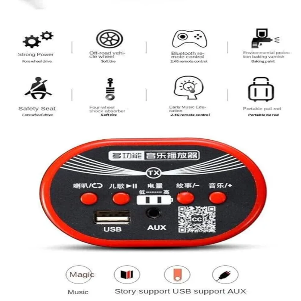 За да биде возењето уште позабавно, овој Џип доаѓа со вграден музички плеер. Децата можат да ја слушаат својата омилена музика преку поврзување со уреди преку AUX, USB, или SD-картичка. Покрај тоа, во музичкиот плеер има вградени песни што ќе ја надополнат радоста на возењето.