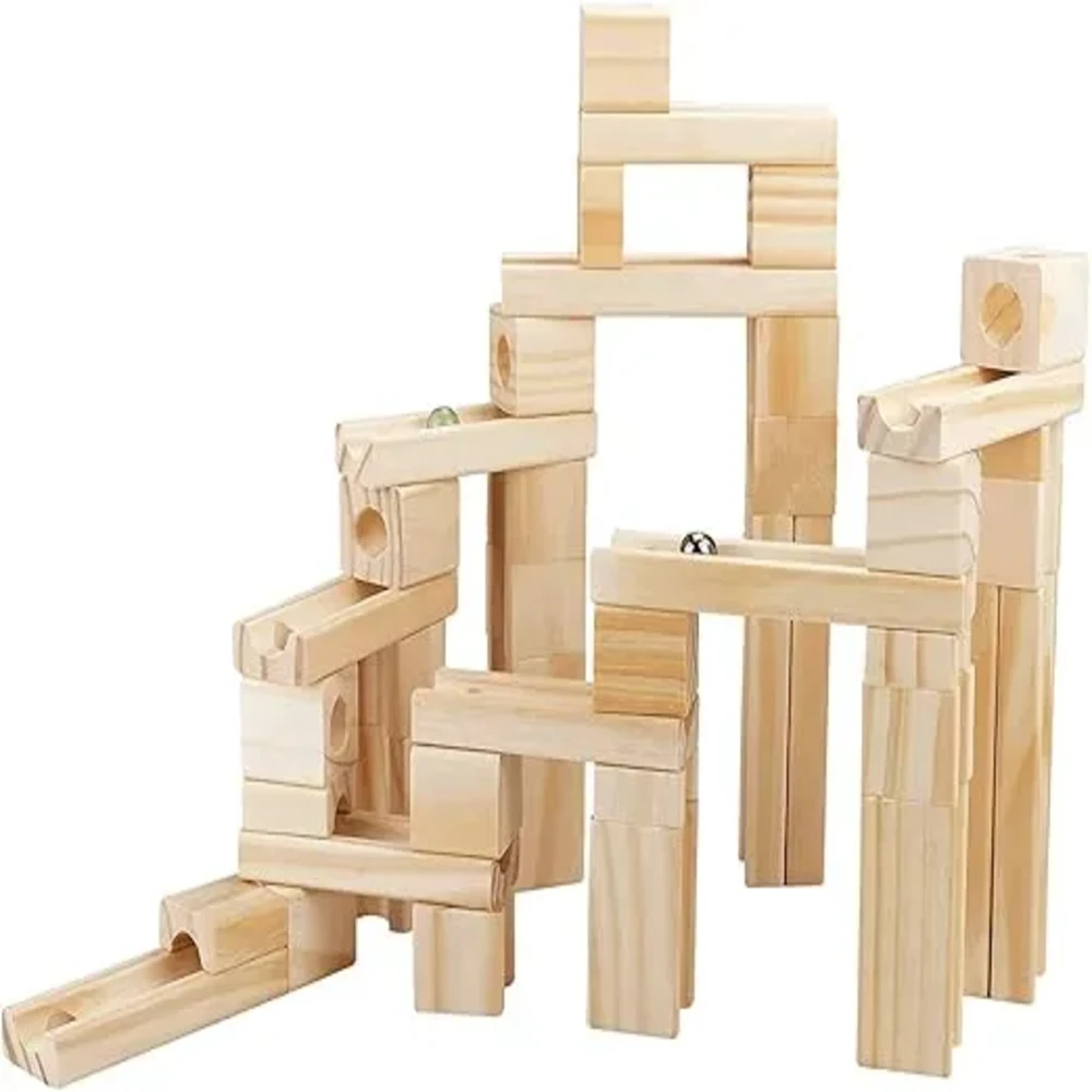 Овој сет вклучува 50 дрвени блокови и патеки, 10 стаклени топчиња и основно упатство за градење. Деталите обезбедуваат децата да можат да ги следат инструкциите или да ја ослободат својата креативност со создавање уникатни лавиринти.