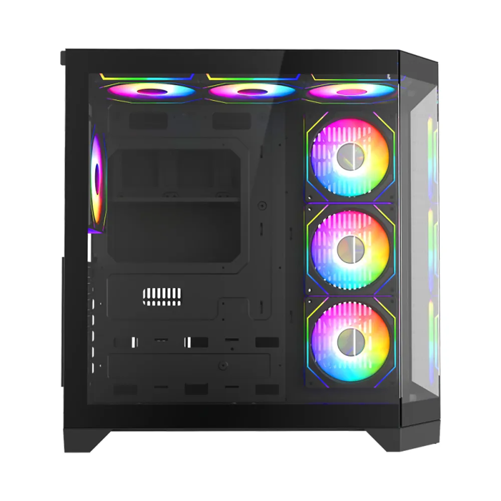 Комбинацијата на ARGB вентилатори, панорамско стакло и скриена кабелска зона создава импресивен визуелен ефект, посебно кога системот е осветлен во темна просторија.
