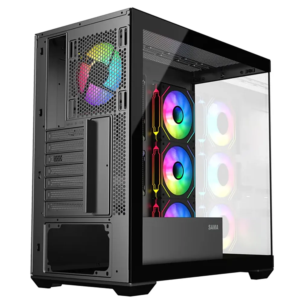 Куќиште Case Sama SV-01 Gaming Black е mid-tower куќиште дизајнирано за корисници кои сакаат комбинација од врвен изглед, одличен airflow и максимална компатибилност со моќен хардвер. Со импресивно 270° транспарентно калено стакло, ова куќиште го претвора вашиот компјутер во вистинска гејминг изложба.