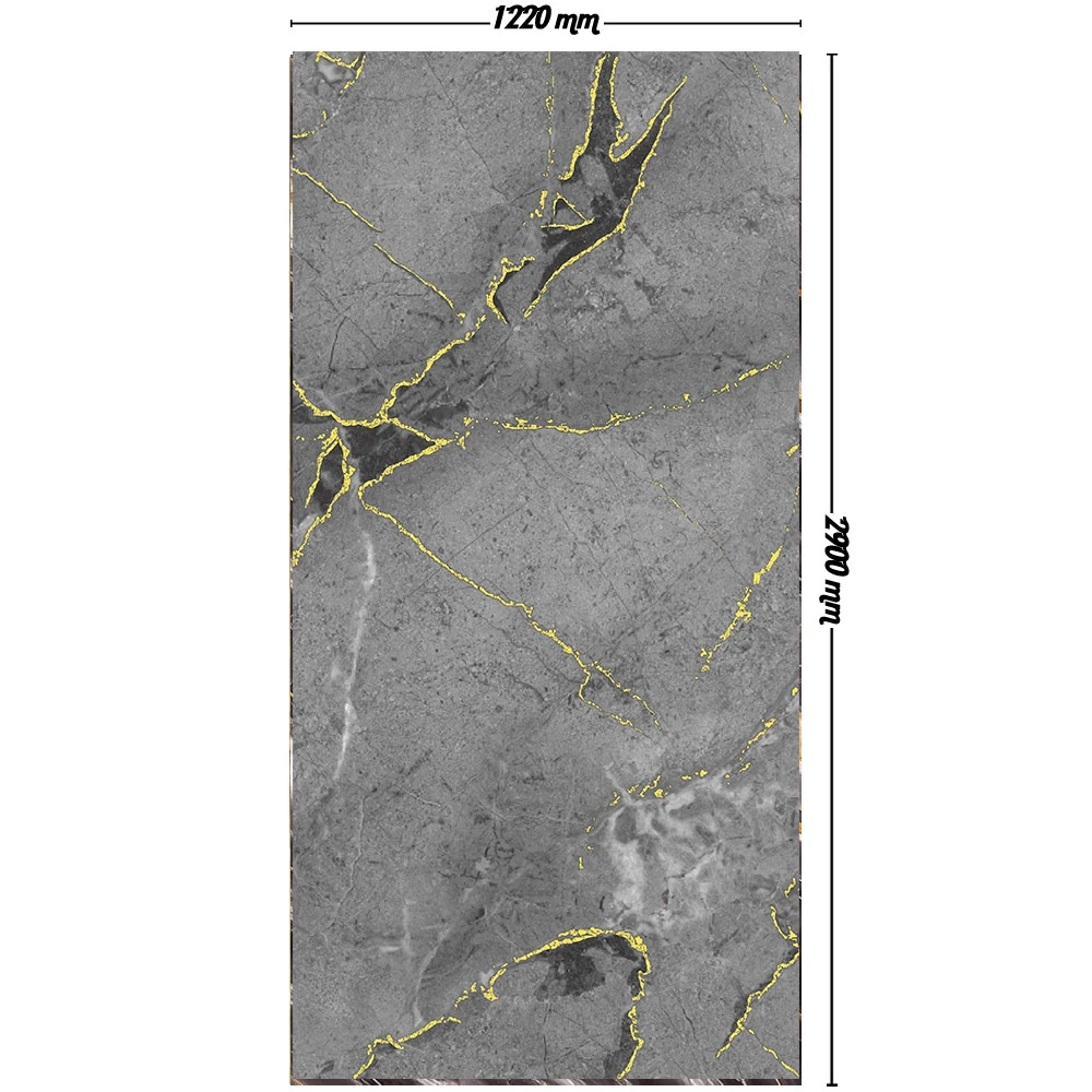 Димензиите од 1220mm ширина и 2900mm висина овозможуваат ефикасно покривање на целосни површини со минимални споеви, што го зголемува визуелниот континуитет. Комбинацијата на неутрална сива основа со живи златни детали создава совршен баланс помеѓу суптилност и луксуз. Материјалот е водоотпорен и лесен за одржување, што го прави идеален избор за простори каде што се бара софистицираност без компромис со функционалноста.